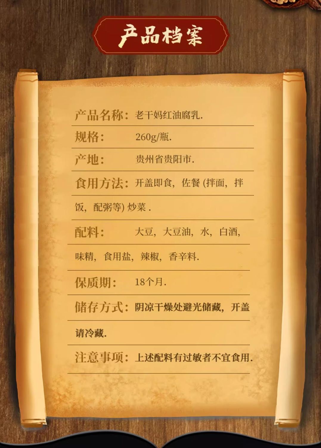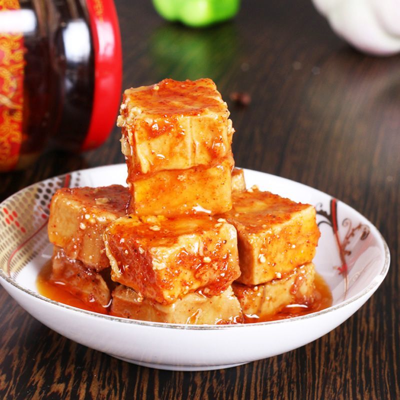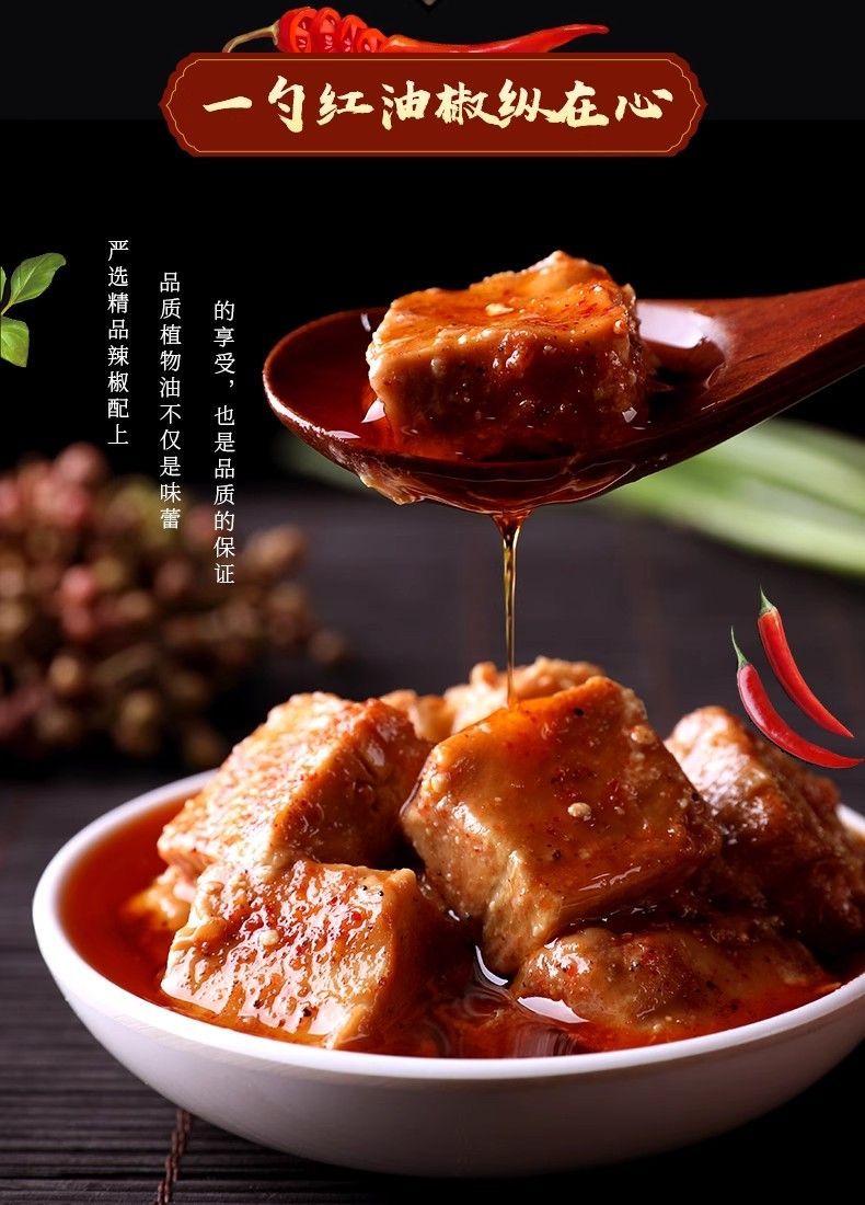 Guizhou Traditional Craft, 180 Days of Natural Fermentation Using non-GMO soybeans as the base, this national staple is crafted through slow immersion in red oil and blended with aromatic spices. The fermented bean curd features intact blocks with a dense, creamy texture. The red oil is clear, rich, and flavorful, releasing layers of complex aromas upon opening—soy, pepper, and wine scents unfolding gradually. Its moderate heat is neither overwhelming nor irritating, leaving a sweet and savory aftertaste. Free from preservatives, it relies on high salt content and airtight sealing for freshness. This versatile flavor enhancer is perfect for breakfast congee, sandwich fillings, lunch rice, and dinner stir-fries. “`Fermented bean curd“` “`Congee“`.